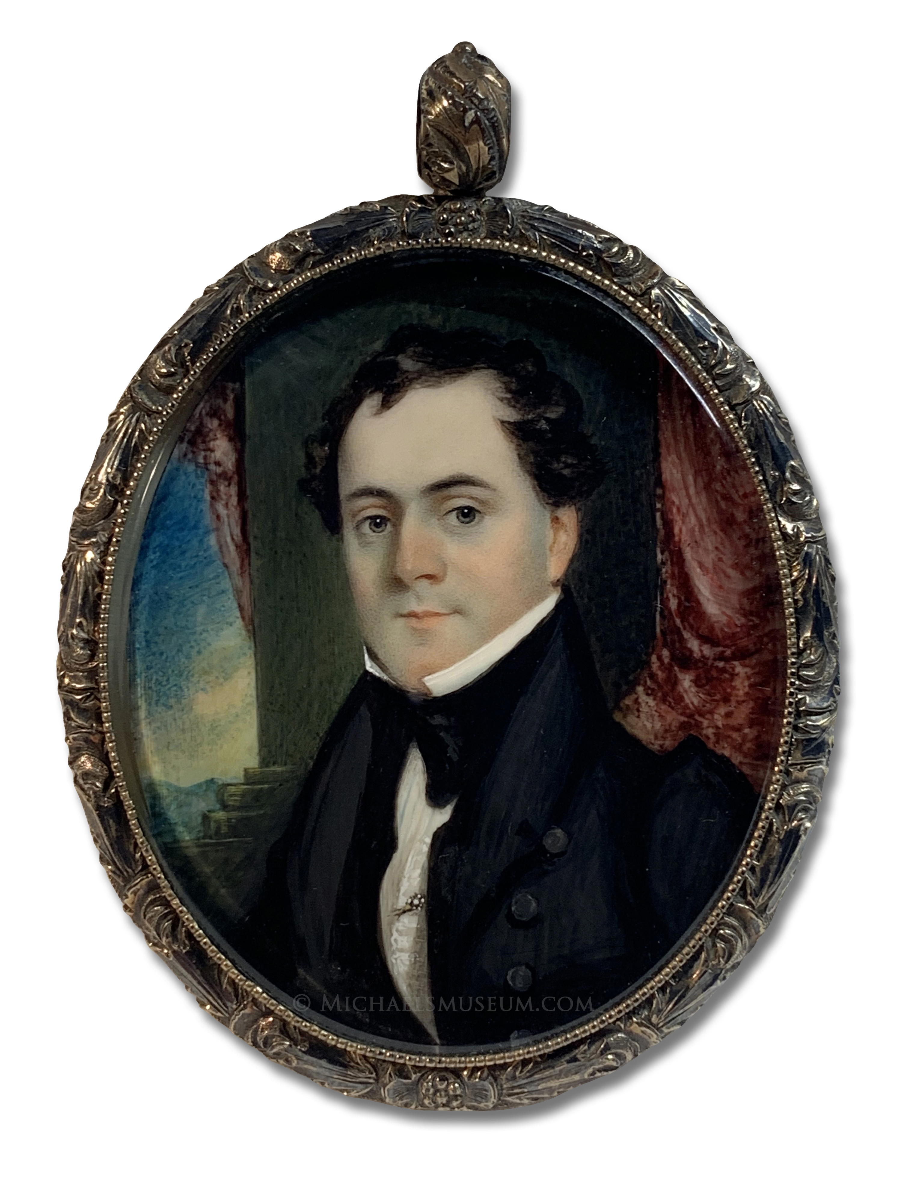 2 x 2 5/16 inches (sight) watercolor on ivory; housed under glass in a gilt metal case with a cast foliate border and bail