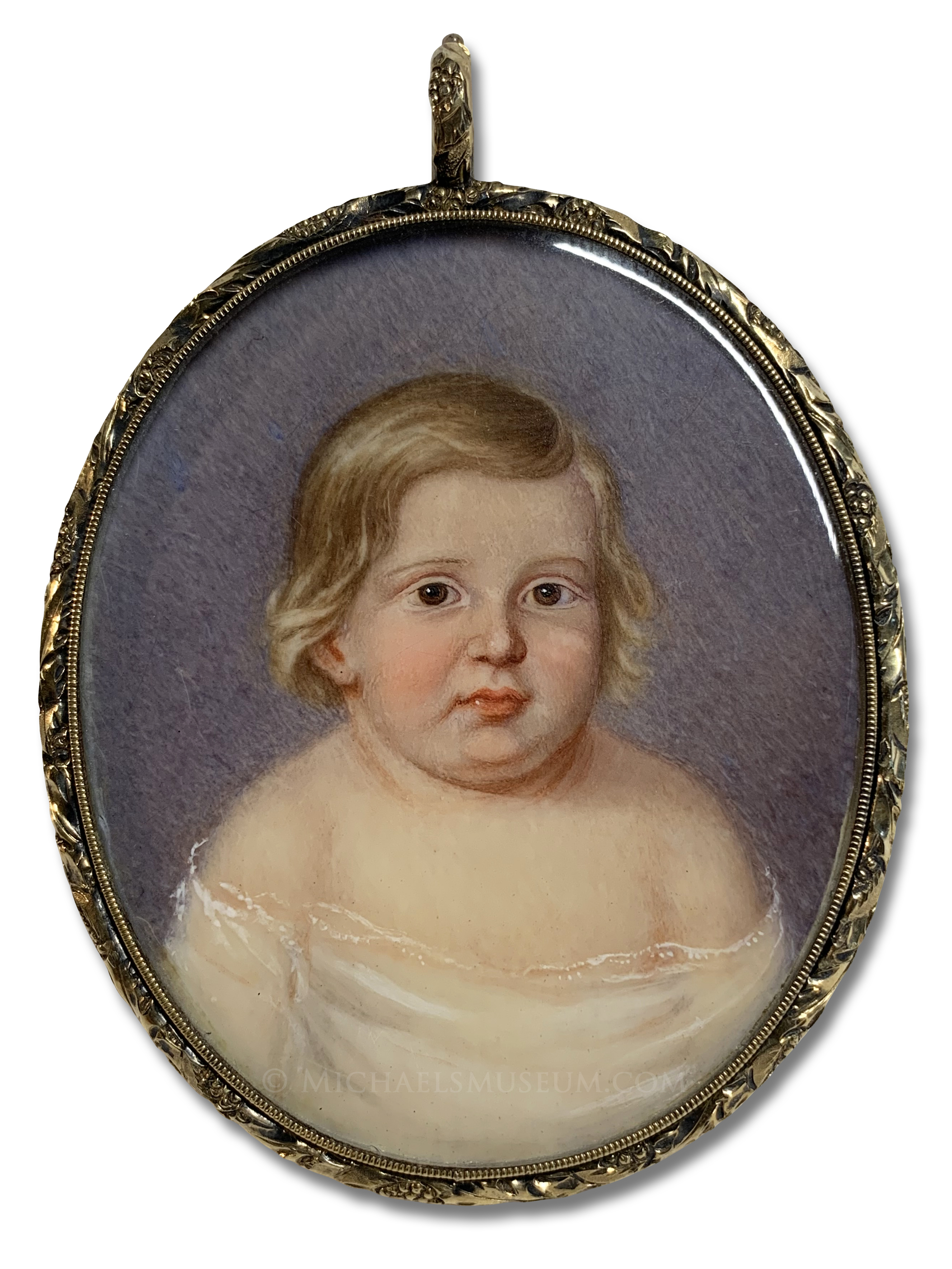 watercolor on ivory; housed under glass in a gilt metal case with a cast foliate border and bail
