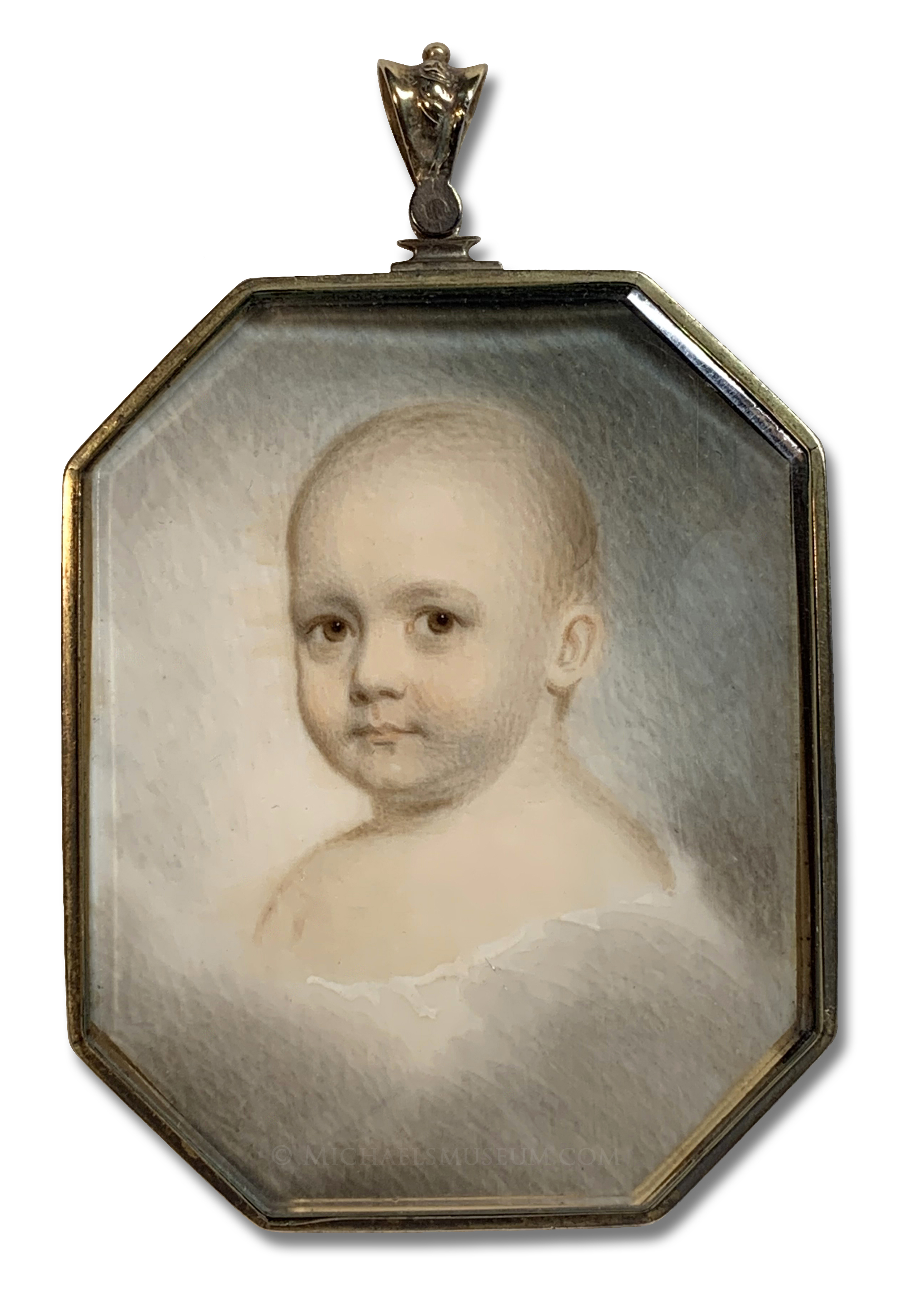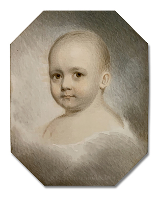 Depicted is an infant with brown eyes, floating amongst clouds. One might assume that the image is a mourning portrait, but Campbell is known to have painted other, very much living subjects in a similar manner. (A good example of this is a miniature by Campbell of Eliza Griffin (1821-1896), a holding of the Los Angeles County Museum of Art since 1926.)