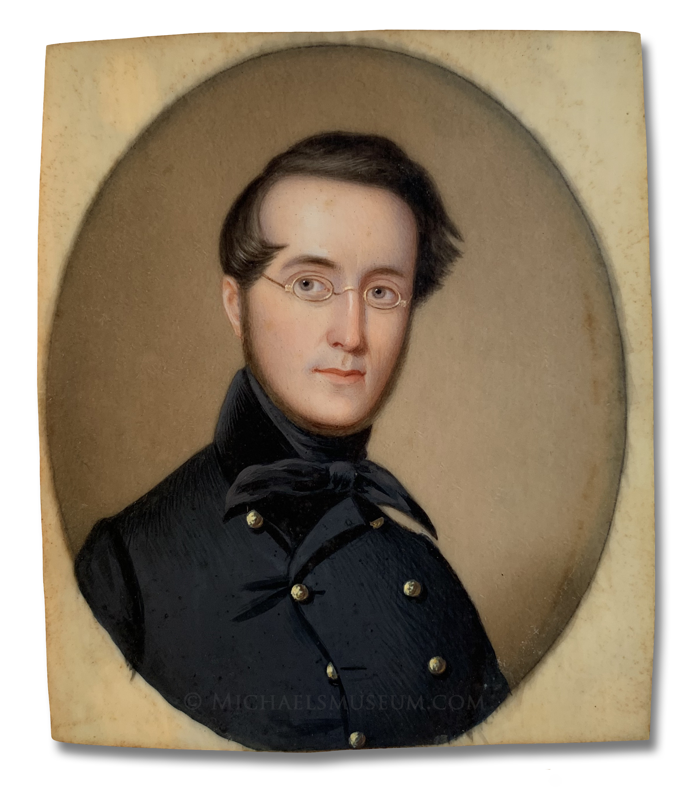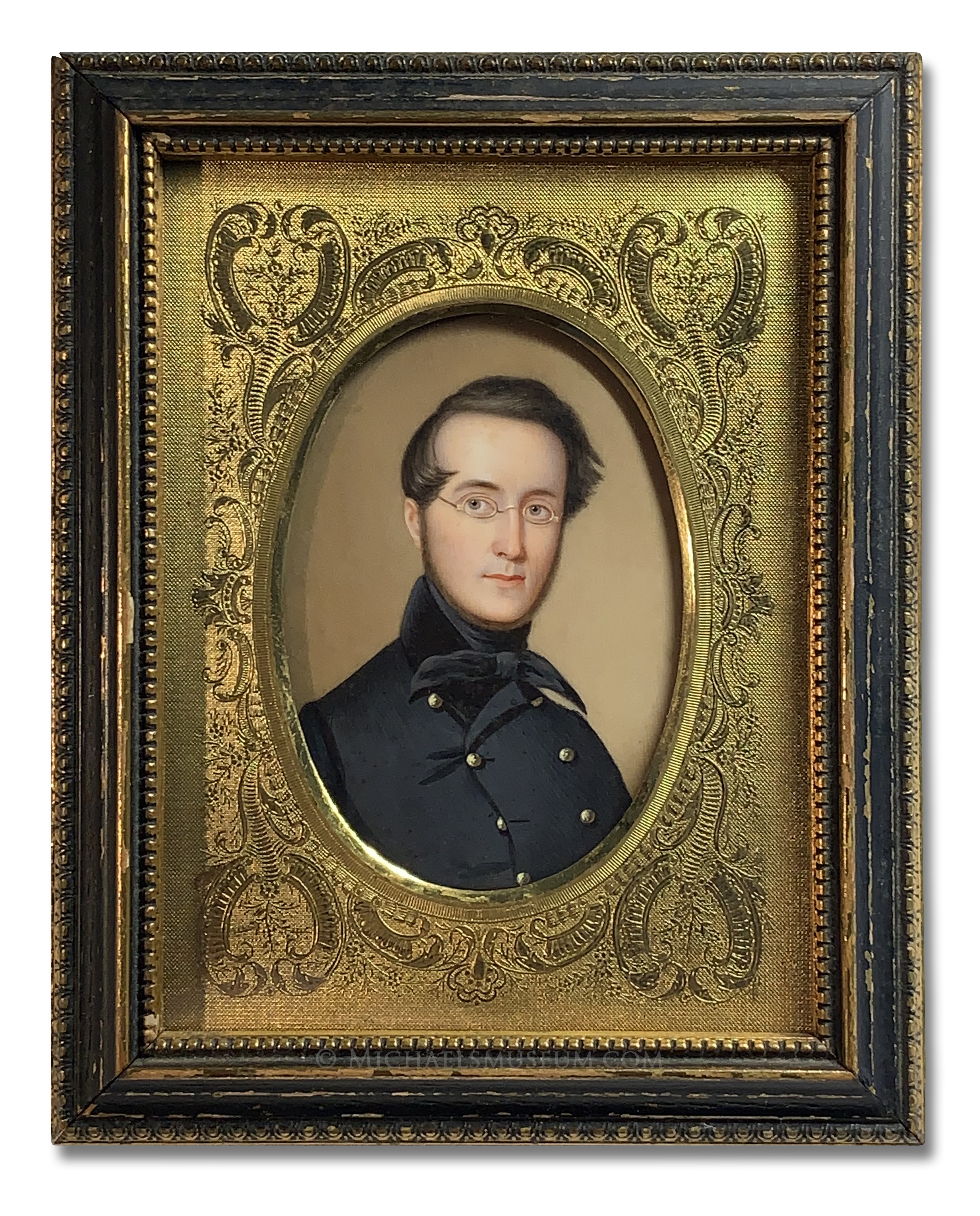 When this portrait miniature was purchased for the collection, the identity of the subject was not known. It was assumed that he was one of three gentlemen that James Wood Dodge had recorded in his account book as having painted portraits for in February of 1850: James Metcalf, David Ker, or Mr. Ernest. Later, a fellow collector kindly shared that he found a record of the miniature in the Frick Art Reference Library Photoarchive. There, the subject was identified as William Chaplain, who was born on June 11, 1811, and died on September 18, 1840 (thus, having died ten years before this portrait was painted posthumously by Dodge). The Frick record further noted that the miniature was painted after another work by an unknown artist.