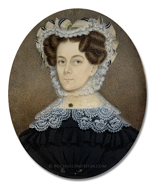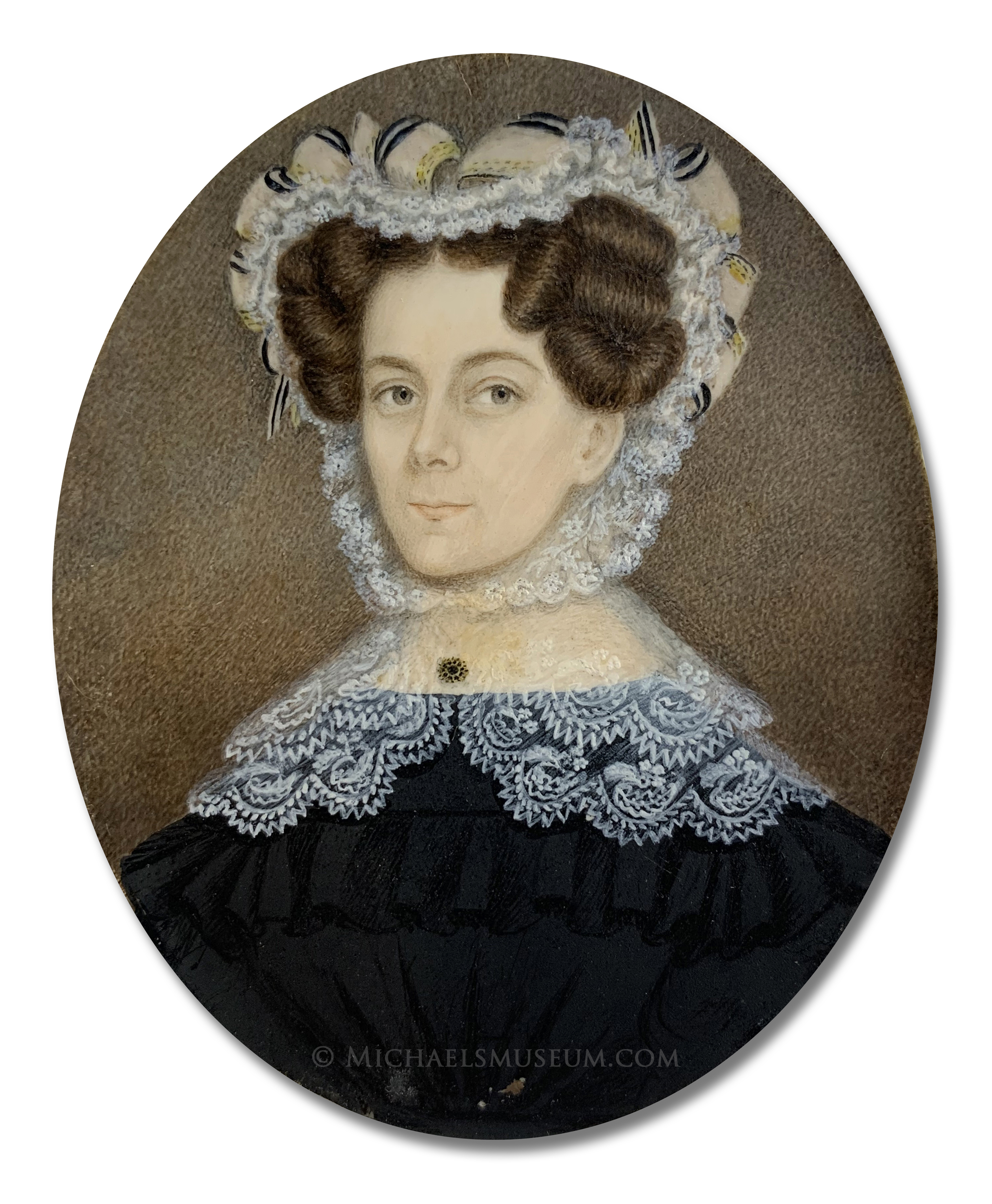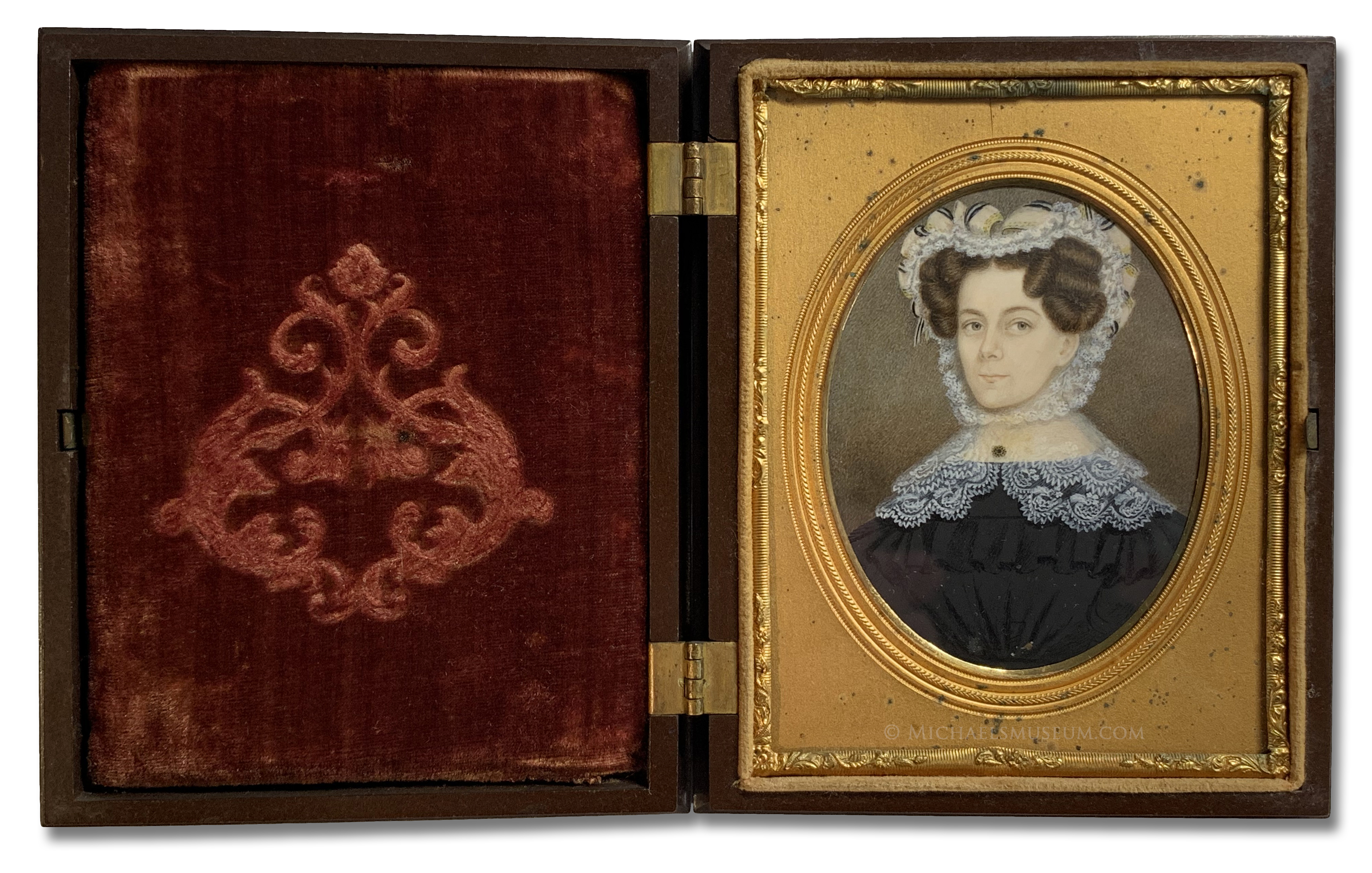 watercolor on ivory; housed under glass in a later (ca. 1857) thermoplastic