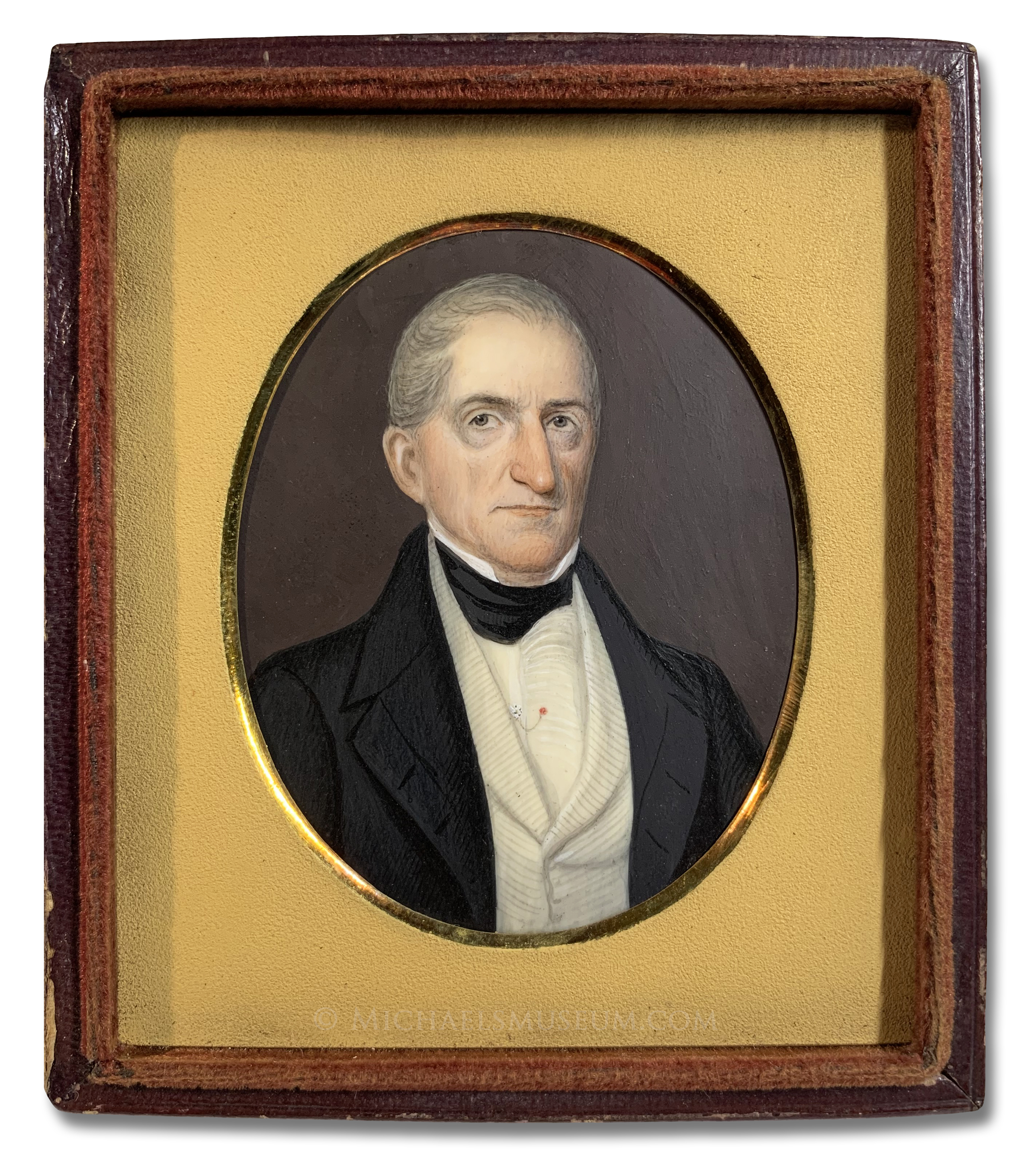 *The background of this gentleman's portrait is painted in a French technique (opaque and dark-toned, somewhat resembling a larger oil painting), leading one to suspect that the artist was likely a French immigrant.