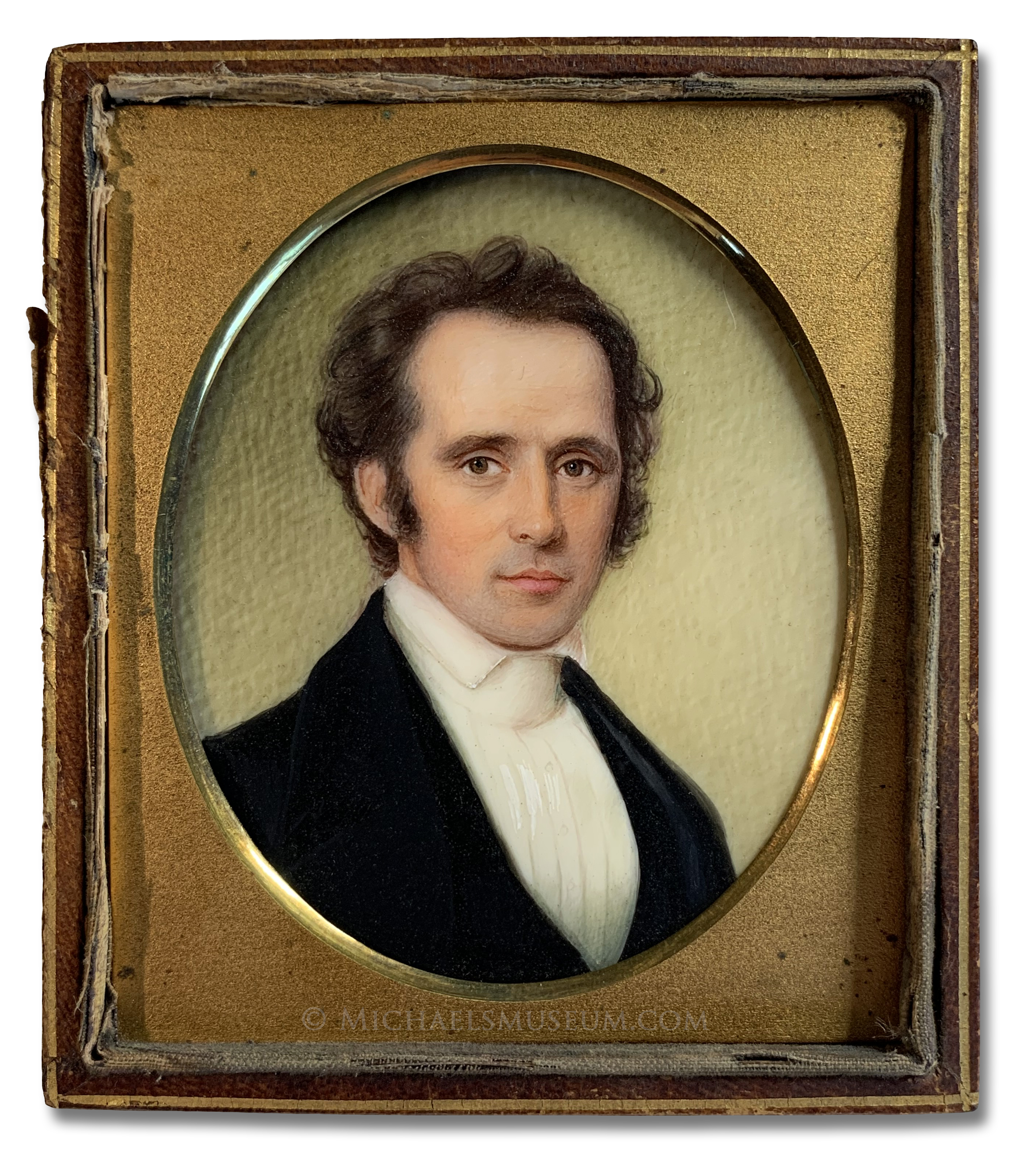 watercolor on ivory; housed under glass in a case of embossed