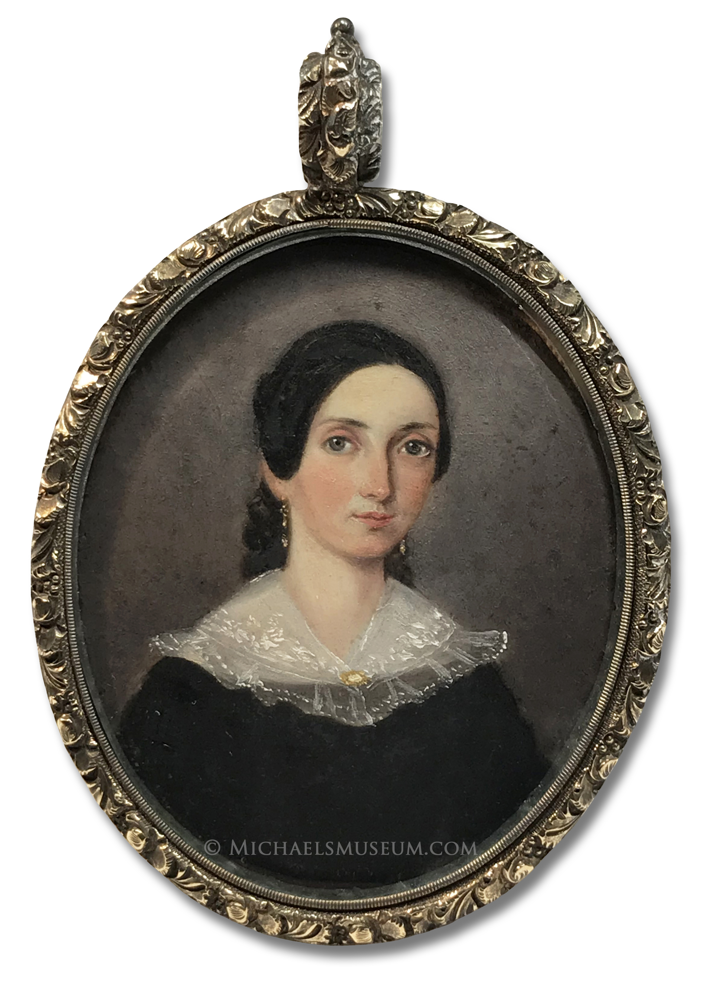 About the Artist: Early American itinerant painter M. E. Mynerts was active from 1821 to at least 1842, traveling throughout the Southeast and Mid-Atlantic States in search of painting commissions. He was primarily a painter of miniature portraits in watercolor on both ivory and paper, but by his newspaper advertisements we know that he also painted profiles (silhouettes) and full-sized portraits in oil on canvas. He also advertised his services as an art teacher (teaching the art of painting fruit, flowers and birds). As evidenced by advertisements Mynerts published in various local newspapers, he is known to have worked in Charleston, South Carolina (1821), Newbern [today known as New Bern], North Carolina (1822), Fayetteville, North Carolina (1823), Easton, Maryland (1831 and 1832), Charlestown, Virginia [today, known as Charles Town, West Virginia] (1833), Pittsburgh, Pennsylvania (1835 and 1836), Nashville, Tennessee (1836), St. Louis, Missouri (1836), New Orleans, Louisiana (1838, 1840 and 1842), and Natchez, Mississippi (1839). Listed by Blättel (pages 662, 663).