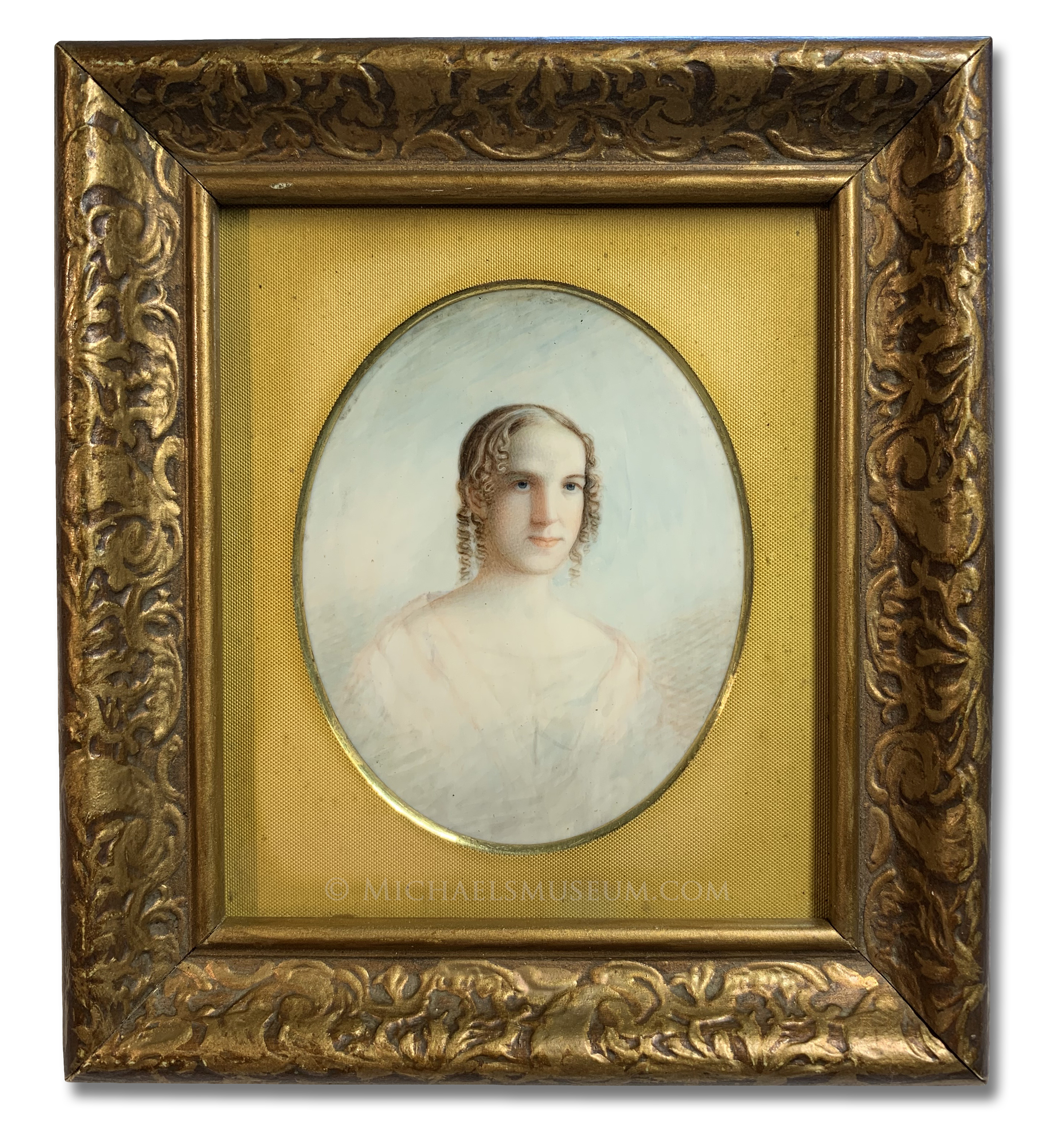 *It is the unfinished, lightly modeled nature of this portrait that leads one to conclude that it was likely painted post mortem. A handwritten note to the reverse reads, "Frances Spencer / Died at / Hartford April 1844 / Aged 22 yrs". Research has revealed errors in the note, however, which was likely written by a family member years after the portrait was painted. To wit, both Connecticut vital statistics and a newspaper obituary reveal that Frances died on April 23, 1843, at the age of 21. She is buried at Hartford's Old North Cemetery; and her grave marker reads, "FRANCES SPENCER / Died April 23, 1843 / Aged 21 years".