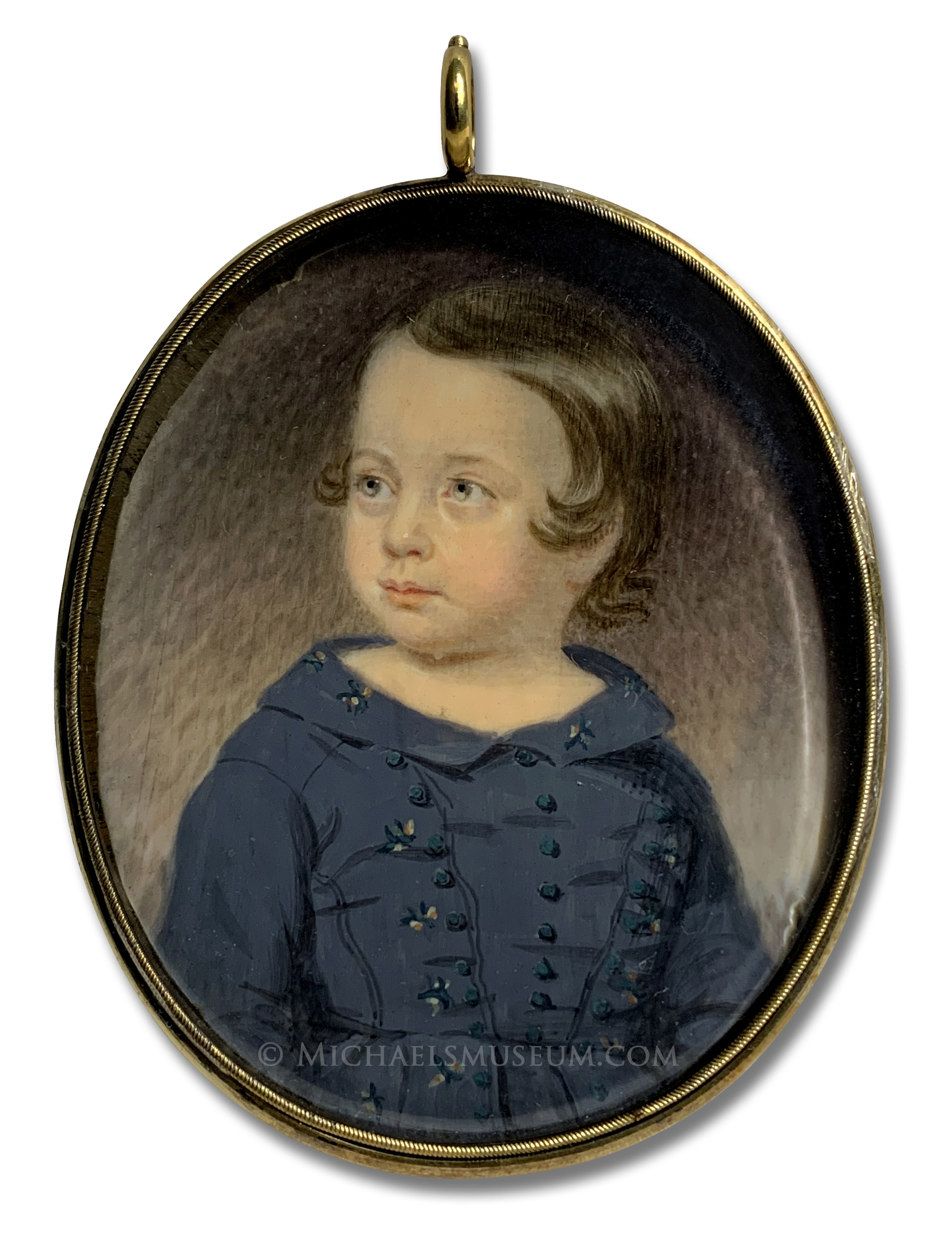 Young, Jacksonian Era Boy Wearing a Blue Dress with an Embroidered Floral Pattern