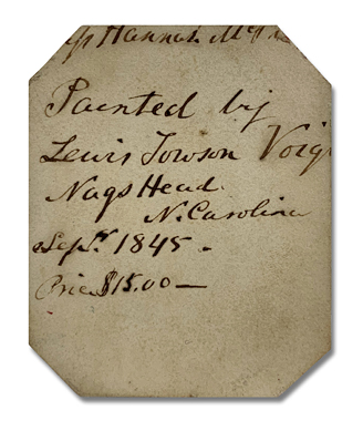 Upon opening this portrait miniature's case, behind the ivory substrate of the portrait, a support card was found with the following inscription by the artist: "fs Hannah Mc----- / Painted by Lewis Towson Voig- / Nags Head / N. Carolina / Sept. 1845 / Price $15.00". (See photo below.) Unfortunately, the manner in which the card was trimmed has removed part of the subject's name. One can easily make out her first name, Hannah, but only the "Mc" of her surname is visible. One can also make out the last two letters of "Miss" before Hannah. (It was common in Georgian and early Victorian English to spell a double "s" as "fs".) It is interesting to note that the price of $15.00 that Voigt charged for his work in 1845 would be equivalent to $514 today. One imagines that the gilt metal case the miniature is housed in might have cost a similar sum (indicating how out of reach the art form would have been for many).