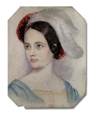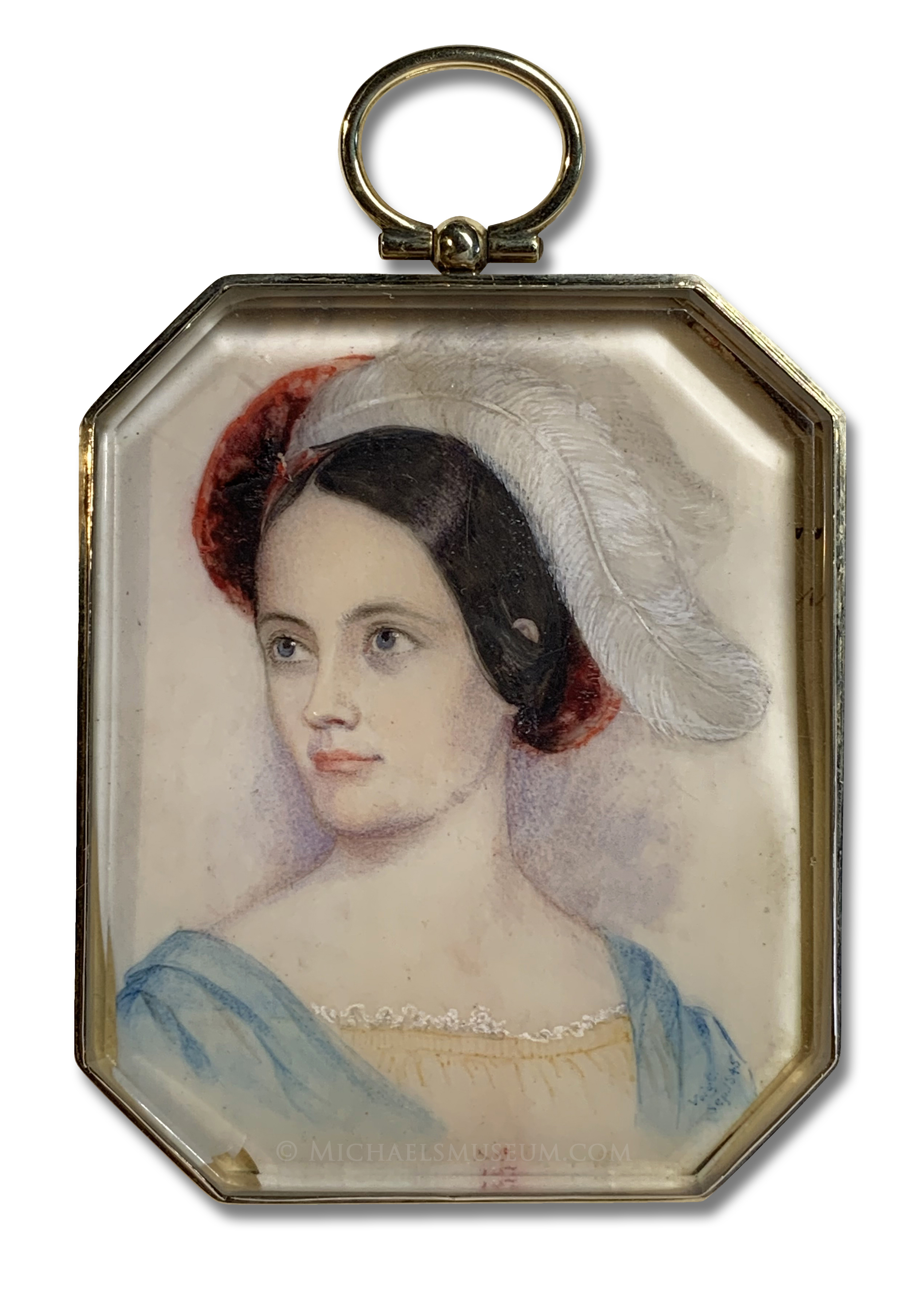 Like many artists of his day, Voigt was not exclusively a painter of portrait miniatures. He also painted full sized portraits in oil on canvas, and he created a prolific body of fashion drawings that were published in "Godey's Lady's Book" over a period of several years. He was also a talented author, having published a number of poems and other writings in various literary publications. (See an example of his writing below.) Relatively few portrait miniatures by Voigt are known to exist today. Only two are documented in the Frick Collection's digital archive (Frick Art Reference Library, New York, New York). One, dated September 1846, is in an octagonal format similar to the portrait of Miss Hannah.