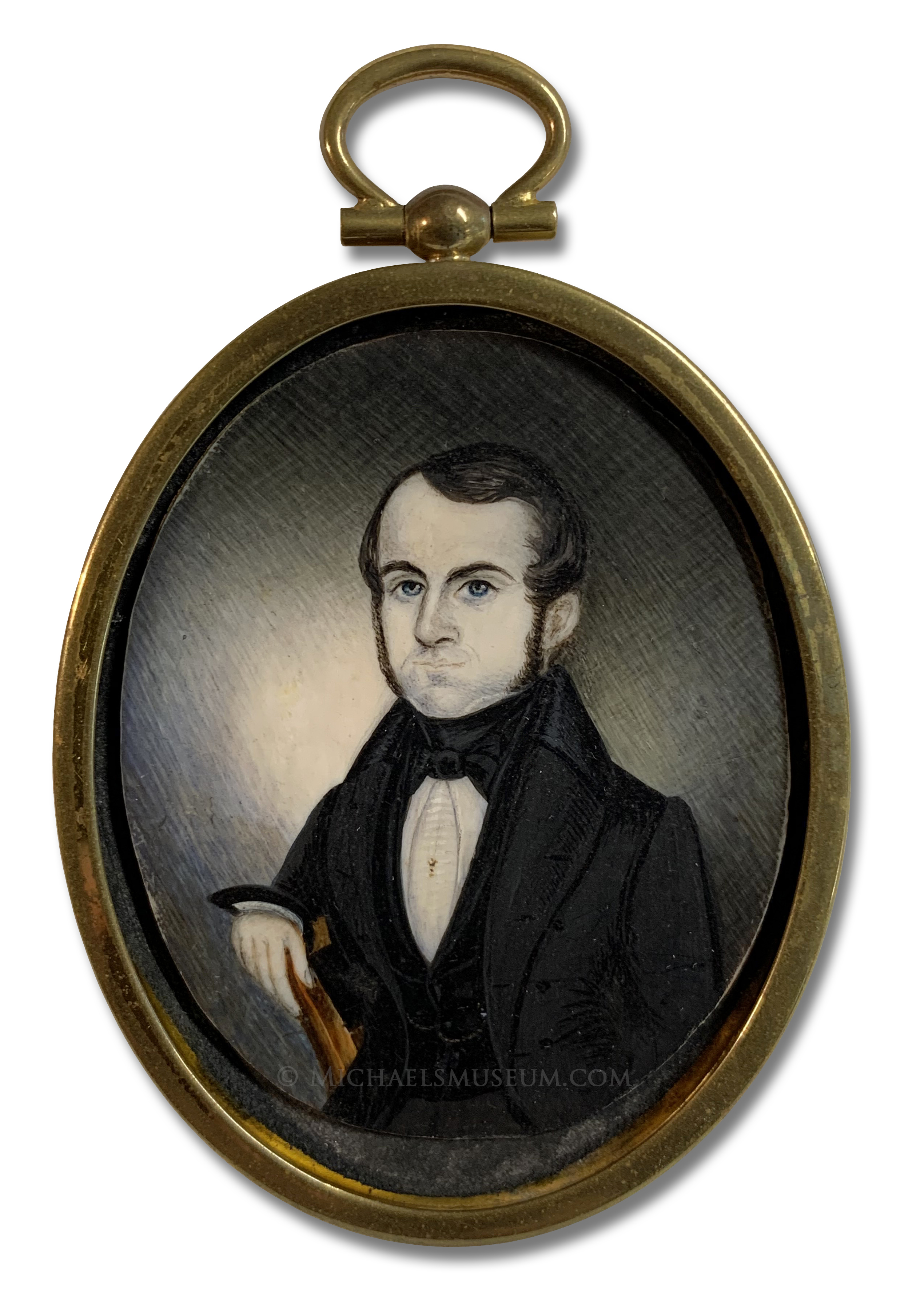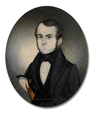 *This portrait miniature's original 1840s case was, at some point, likely damaged beyond repair. In the future, we may replace the current, ill-fitted case with a period-appropriate alternative; but, given the miniature's provenance with the current case, we have chosen to leave it as is for the time being.